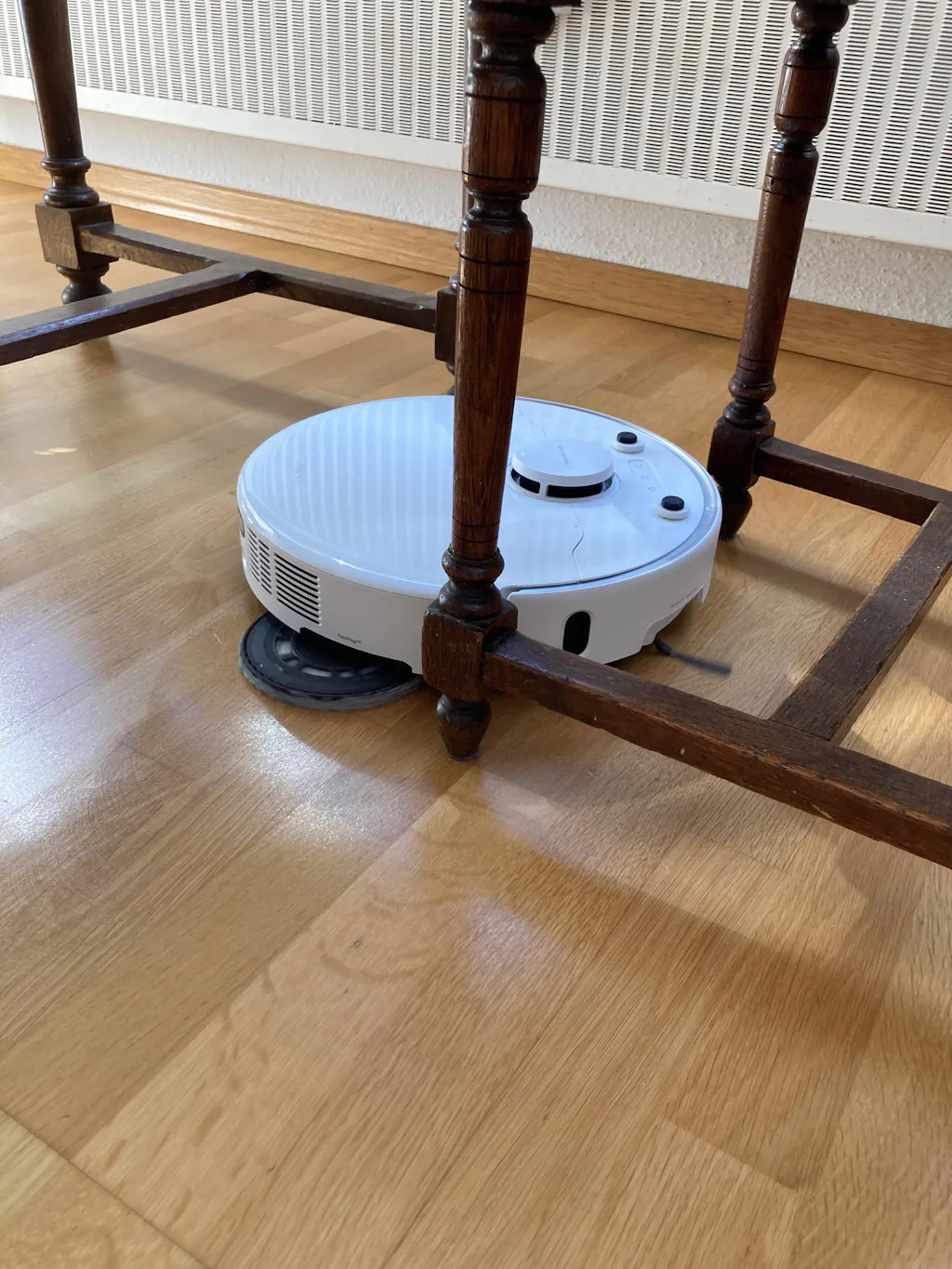 Der Mova P50 Ultra bewegt sich rund um den Esstisch sehr geschickt und gezielt. Er hält sich nah an den Tischbeinen entlang, fährt aber nicht einfach nur wild im Kreis, sondern orientiert sich klar am Raum und umrundet die Möbel sauber. Die Bewegung wirkt ruhig und überlegt, eher wie ein ordentlich arbeitendes Reinigungsgerät statt wie ein orientierungsloser Roboter.